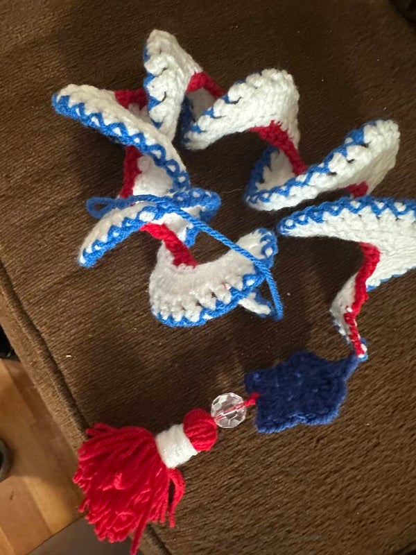 Red, White, and Blue spinner adorned with tassle and clear bead.